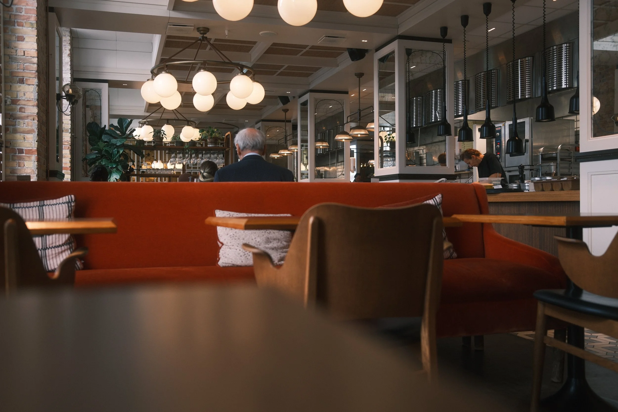 Inside a modern restaurant with hanging light fixtures, a brick wall, and a visible kitchen area. There are patrons seated on a plush red sofa and wooden chairs, with a woman working behind the counter.